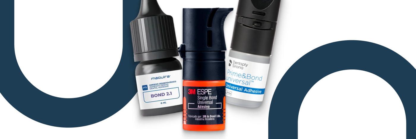 Exemplo de marcas: Single Bond 2 (Solventum), Prime & Bond 2.1 (Dentsply Sirona), Ambar (FGM).