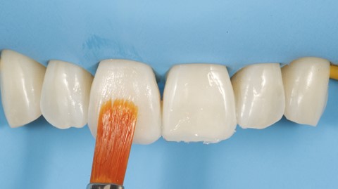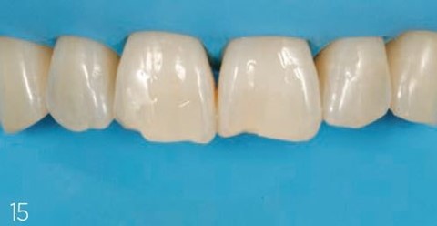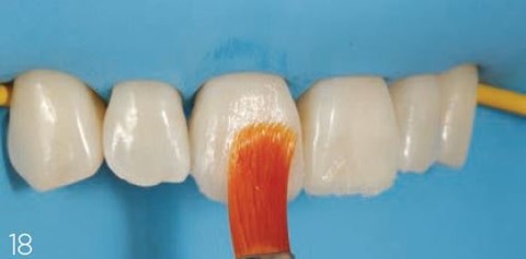 Figuras 14 e 15 — A aplicação do adesivo Âmbar Universal APS, praticamente incolor, possibilita a formação de uma fina película que se mimetiza com o substrato dental, favorecendo a naturalidade da restauração, sobretudo quando associado à resina Vittra APS Unique.
