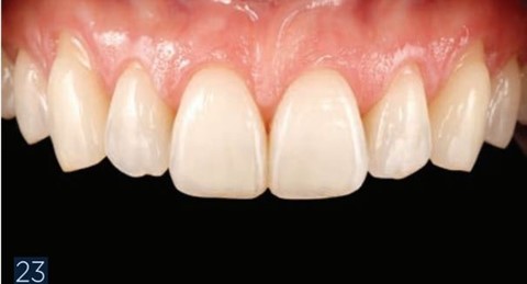 Figura 23 — Imagem intraoral das restaurações finalizadas, 15 dias depois. Observa-se um bom mimetismo apesar de não ter realizado nenhum bisel.