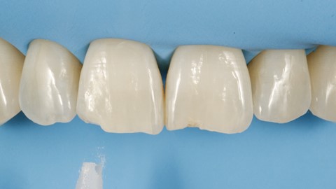 A paciente apresentava uma cor 2M2-2M3 da guia VITA 3D Master e fraturas das bordas incisais provocadas por hábitos nocivos.
