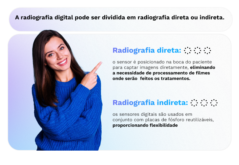 A radiografia digital substitui o uso de aparelhos de raio-x e filmes radiográficos tradicionais por sensores eletrônicos que captam imagens digitalmente.